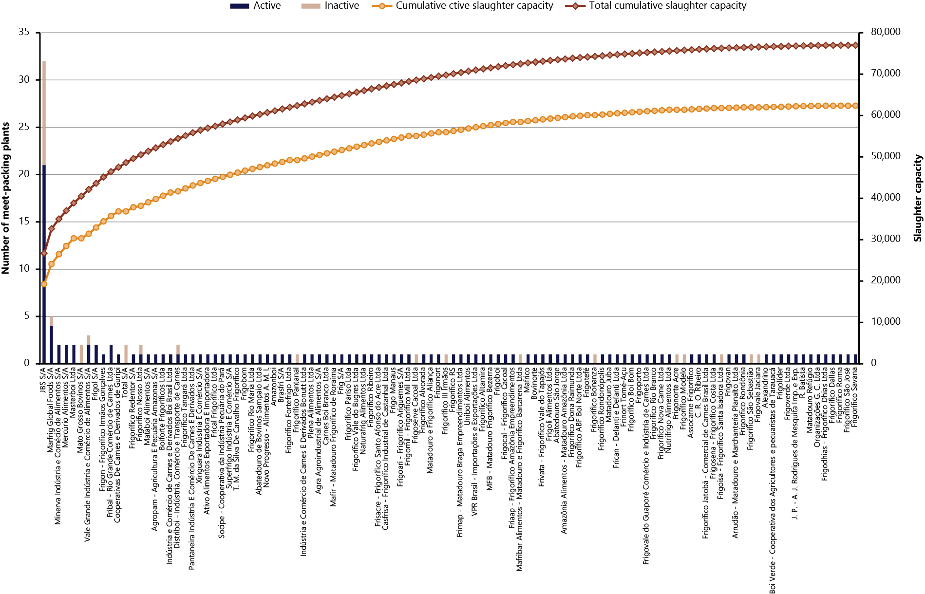 Figure 8. Number of active and inactive meat-packing plants by company and cumulative slaughter of all meat-packing plants and only of the active in the Brazilian Amazon in 2016