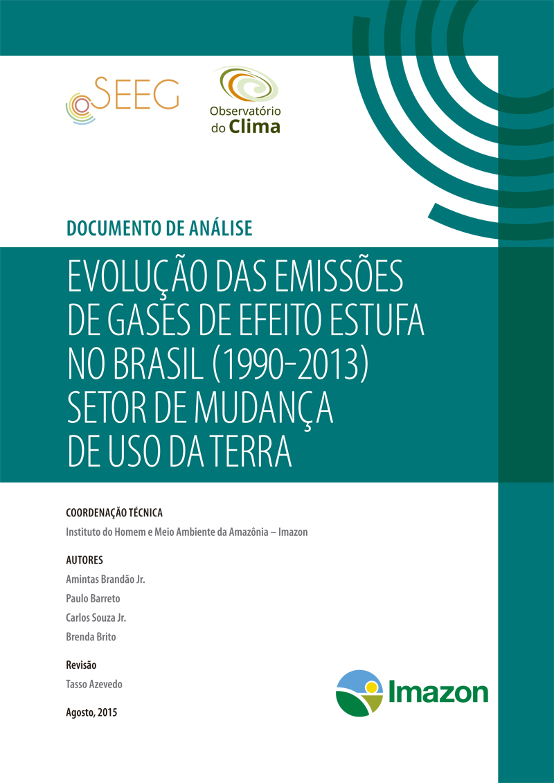 Brandão Jr., A., Barreto, P., Souza Jr., C. & Brito, B. 2015. Evolução das emissões de gases de efeito estufa no Brasil (1990-2013) Setor de Mudança de Uso da Terra (p. 29) Belém: Imazon. Neste documento, analisamos as estimativas de emissões do setor de Mudança de Uso da Terra (MUT) que foram geradas pelo Sistema de Estimativas de Emissões de Gases de Efeito Estufa (SEEG) para o período de 1990 a 2013. O projeto SEEG é uma iniciativa do Observatório do Clima (OC) – uma rede de instituições da sociedade civil. As emissões do SEEG cobrem os setores de MUT, Agropecuária, Energia, Indústria e Resíduos. O Imazon foi responsável por calcular as estimativas de emissões do setor MUT a partir das metodologias desenvolvidas pelo Painel Intergovernamental sobre Mudanças Climáticas das Nações Unidas (IPCC – em inglês) e pelo Ministério da Ciência, Tecnologia e Inovação (MCTI). As fontes de emissões do setor MUT englobam as alterações da paisagem, a queima de resíduos florestais e a calagem de solos. As fontes de remoções são contabilizadas em separado e são aquelas relativas às florestas localizadas em Áreas Protegidas que não foram convertidas em outros usos (por exemplo, desmatamento) conforme metodologia do Inventário Brasileiro de Emissões e Remoções Antrópicas de GEE. A soma das emissões e remoções resulta nas emissões líquidas. No Brasil, o setor MUT gerou, até 2013, cerca de 30 milhões de t CO2e, o que representou 62% das emissões nacionais para o mesmo período. Em segundo lugar, o setor Agropecuário contribuiu com 17%, seguido pelo setor de Energia com 15%. O desmatamento é a principal fonte de emissão do setor MUT, somente o bioma Amazônia, por exemplo, contribuiu com 43% das emissões brasileiras. Portanto, as ações de redução de emissões desse setor devem estar atreladas às estratégias de redução de desmatamento brasileiras. Desde 2009, através da Política Nacional sobre Mudança do Clima (PNMC), o Brasil estabeleceu metas de redução de emissões a serem alcançadas até 2020. Apresentamos, nas próximas seções, as emissões do setor MUT no contexto das emissões nacionais e uma análise de como o Brasil está em relação às metas de redução. Por fim, recomendamos ações para acelerar a redução das emissões de GEE. Baixe aqui o arquivo. Visualize aqui a versão online da publicação