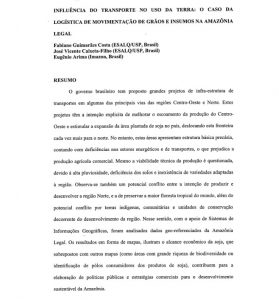 O estudo “Influência do transporte no uso da terra: o caso da logística de movimentação de grãos e insumos na Amazônia Legal”, realizado por Fabiano Guimarães Costa, José Vicente Caixeta-Filho e Eugênio Arima, analisa como projetos governamentais de infraestrutura de transporte impactam a expansão da soja na Amazônia Legal, utilizando um modelo baseado na teoria de localização de von Thünen e Sistemas de Informações Geográficas (SIG).
